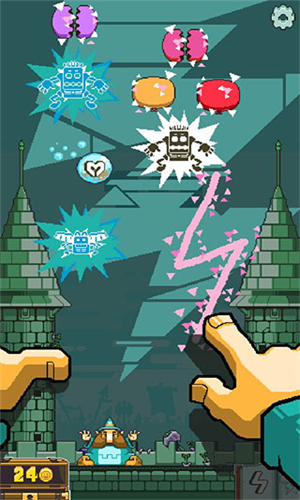 在游戏中,所有机器人的头上都绑着一些气球,玩家可以通过在屏幕上画出相应的图案来击碎气球,从而将机器人砸成碎片。然而,随着游戏的深入,敌人越强大,头顶的气球越多,图案越复杂,逼得你不得不匆忙“画图施法”。