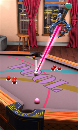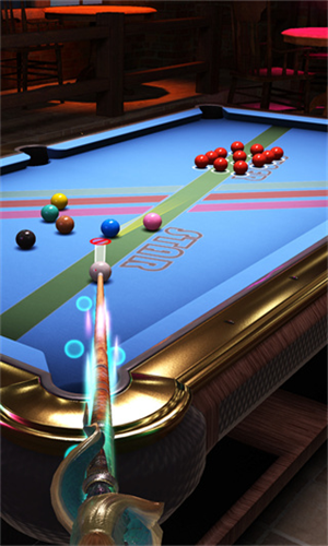 使用标准的8 球和9 球规则与计算机AI 对战。触摸屏幕调整方向,拖动右侧的力量条,松开击球。在自由球模式下,按住任意位置移动母球,再次点击母球确认位置。