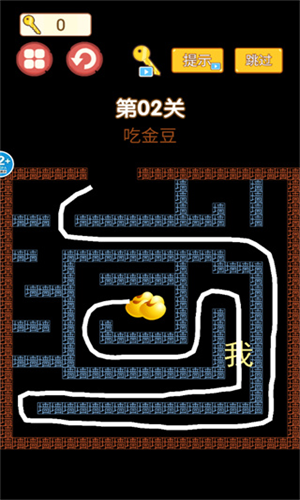 第一关是迷宫挑战。简单来说,就是通过画线找到金豆的位置,然后“我”就会按照画好的线移动,从而吃掉金豆,逃离迷宫。