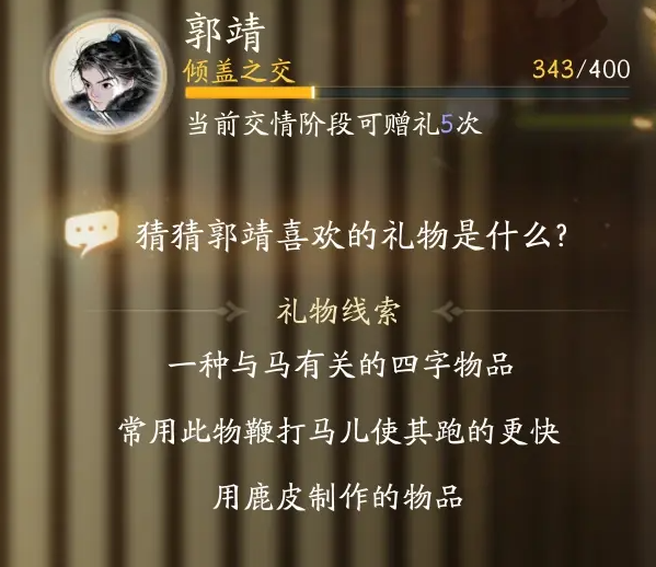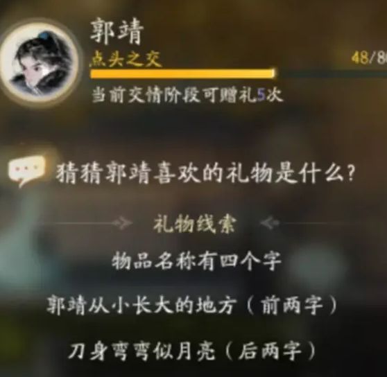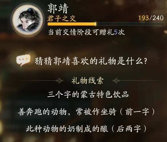 手游中不同的角色有不同的喜好。很多玩家都想知道郭靖喜欢什么手游?郭靖最喜欢的礼物有:蒙古弯刀,金疮药,香菇炖鸡,鹿皮鞭,磨饮乐,巨胜奴,牛皮鞍,夜狼牙坠,马奶酿,串蜡。以下是边肖为大家整理的郭靖最喜欢的礼物的名字。