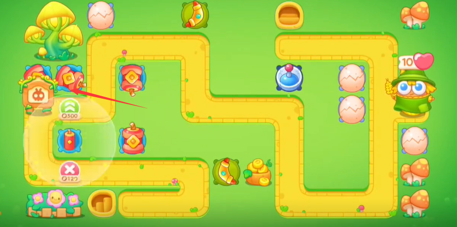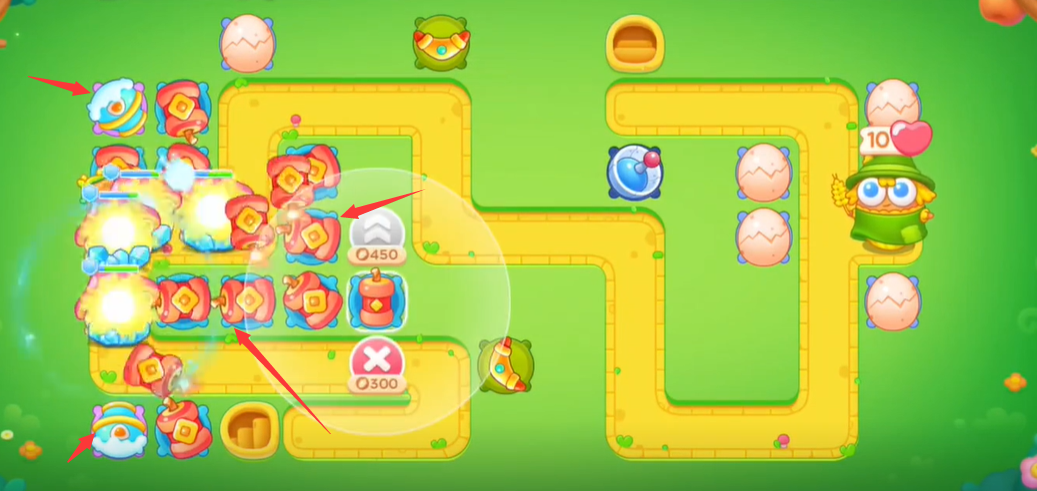 4。左边在怪物诞生地造鞭炮减速攻敌,清除全屏障碍;