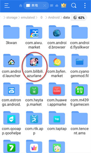 1。打开手机的文件管理器,点击文件夹中的[Android]-[Date]-[com . bilibili . Azur lane]。