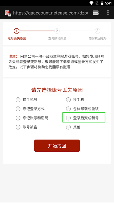 3。选择原因为[登录后更改为新号码],然后单击[开始检索]。
