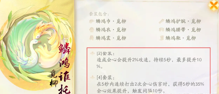 2。四件套:治疗队友时会额外获得一个随机效果:外功伤害提升/内功伤害提升/外功伤害减免/内功伤害减免。