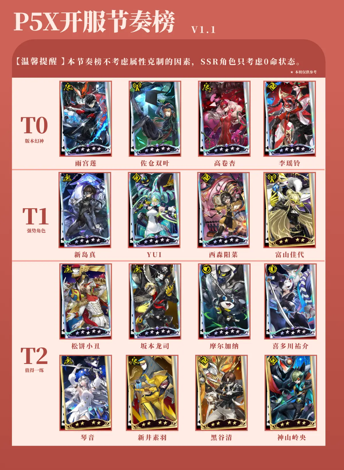 《女神异闻录之夜幻影》游戏中有许多不同实力的角色。很多朋友不知道这些角色的强度节奏表是什么。比如动力精二、远山佳代、佐仓双叶都是T0。存在感很强,远山佳代是一个有着贤妻形象的辣妹。她也是玩家们讨论最多的角色。更详细的人物分析在下面的文章中。