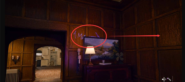 3. 启动发电机后,回到一楼。你会看到一架钢琴,旁边有一盏黑光灯。用黑光灯看地面,你会看到钢琴旁边的墙上有脚印,表明那里有一扇暗门。