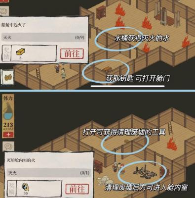 5.小木屋灭火的顺序:找到藏钥匙的箱子拿到钥匙打开工具箱拿到破坏废墟的工具清理废墟进入房间灭火。