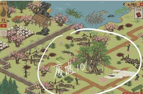 3.种植桃花后,玩家需要修复两块废墟,如图;