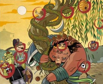 拔树的熊是一只秃兔子,还有一只打着狗皮膏药的狗。地上有珠子,有和谐。柳树代表一只羊,后面有一只老虎。
