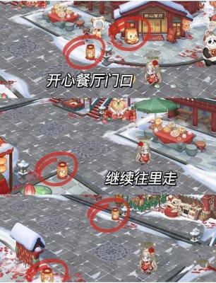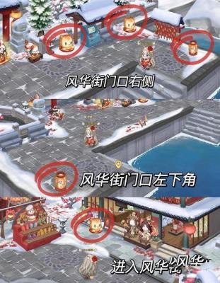 灯笼分两个在风华街入口右侧,风华街入口左下角,风华街和欢乐餐厅门口,再往前走会有两个灯笼。