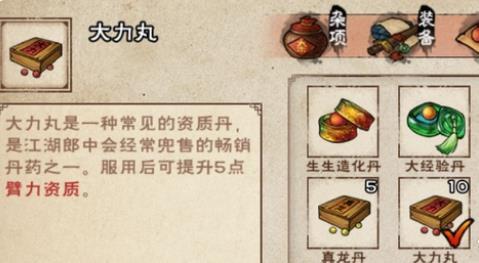 配方:甘草*14、枸杞*10 效果:增加5点臂力资质[每位角色仅限服300粒]