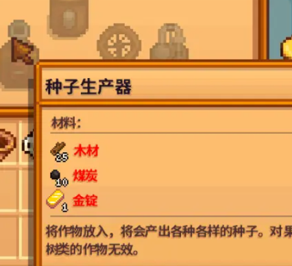 种子生产者制作材料:25 个木材、10 个煤炭、1 个金锭。
