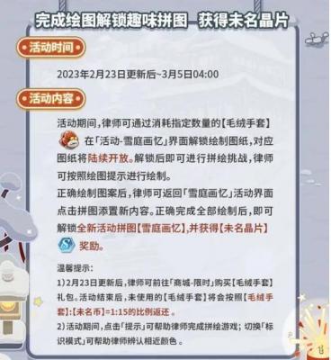 活动期间,律师可在“活动-雪苑”界面解锁消耗指定数量的【毛绒手套】绘制设计图,相应的设计图将陆续发布。进入解锁后即可开始拼图挑战,律师可按照绘画提示进行绘画
