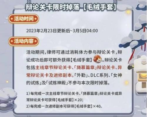 活动期间,律师可通过消耗体力参与辩论关卡,辩论成功后可额外获得【毛绒手套】。辩论关卡包括主线章节辩论关卡、《美丽篇章》辩论关卡、变态辩论关卡和高级副本。 《战地勤务》、DLC系列、《女神的试炼》、《试炼神殿》不参与本次限时掉落。