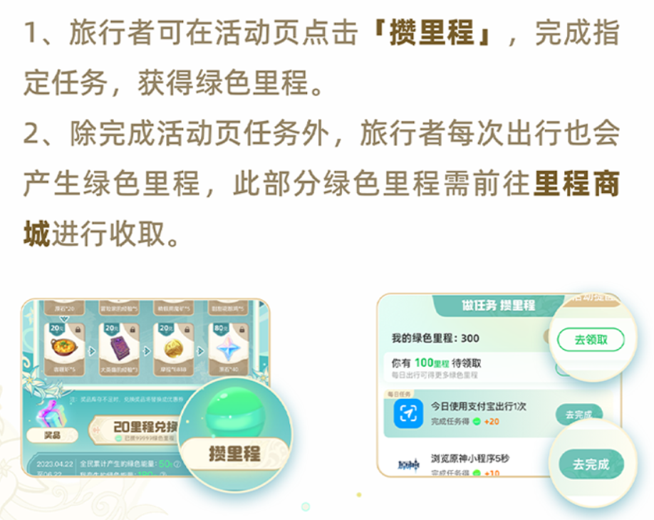 2、旅行者除了完成活动页面上的任务外,每次出行还会产生绿色里程,这部分绿色里程需要在里程商城中收集。
