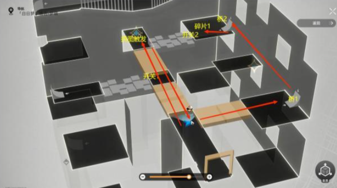 2.进入拼图界面,到达图标所示位置中间即可获得梦想泡泡,按开关1前往1号桥打开第一个宝箱;