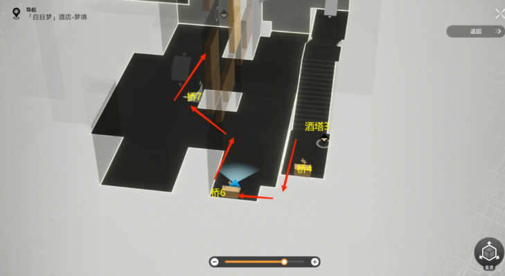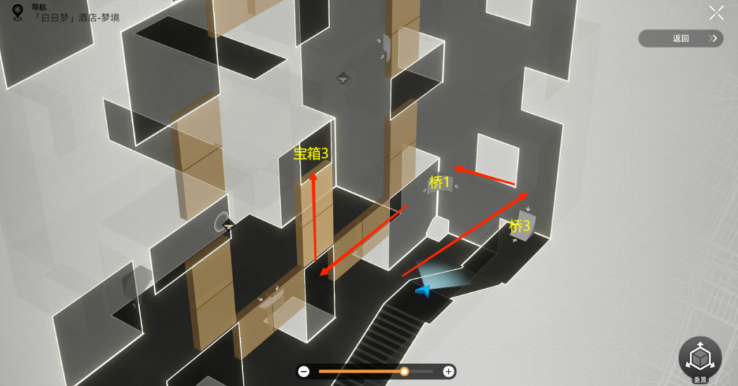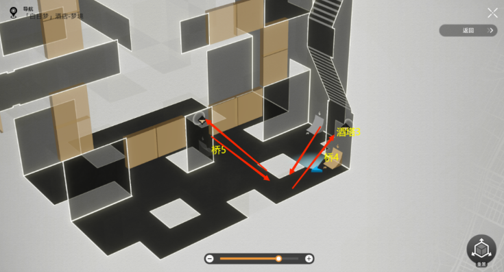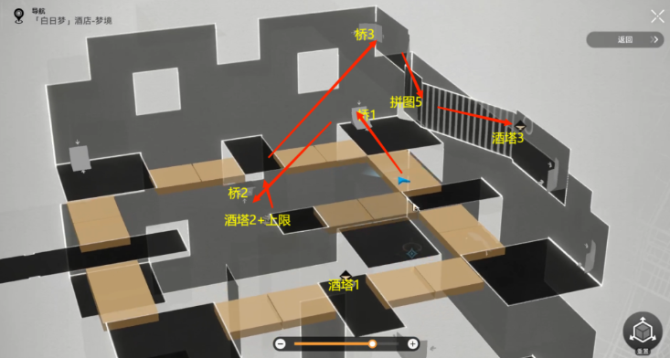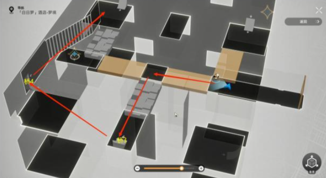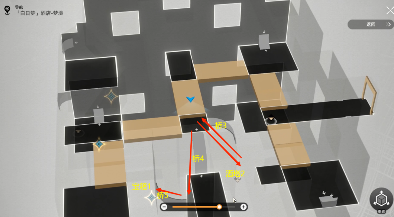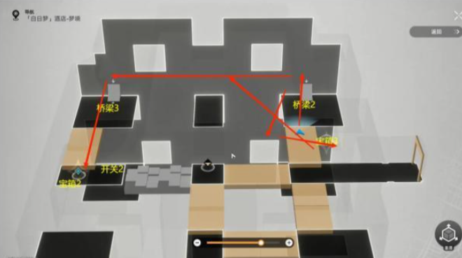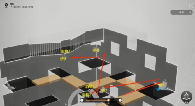 5.返回酒塔补充梦幻泡泡,按照图示路线在3号桥和4号桥处找到第四个宝箱;