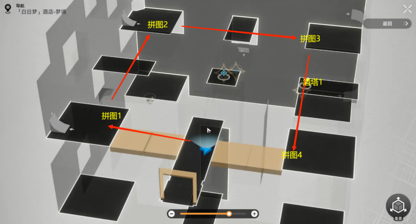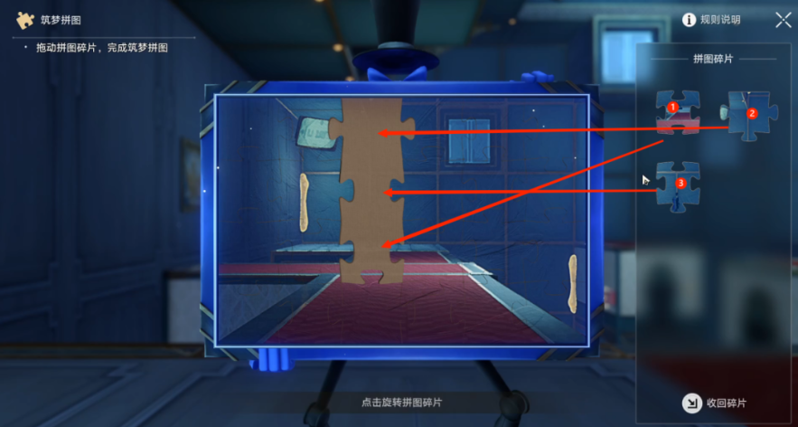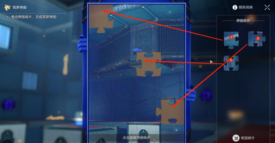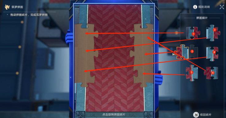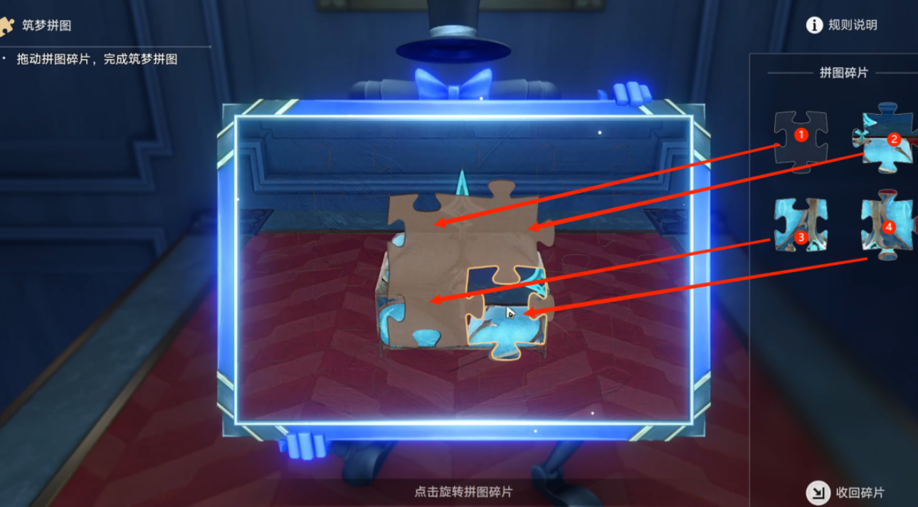 7.最后回到中间即可完成拼图。 3号旋转3次,4号旋转1次,获得第六个宝箱;