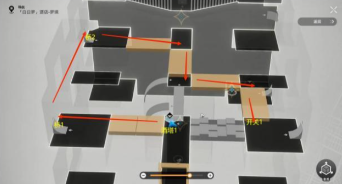 4、第二次进入拼图场景时,先补充梦幻泡泡,触发拼图打开开关1,通过桥1和桥2获得碎片1,打开开关2;