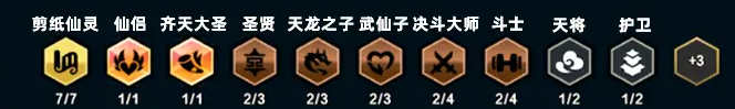 二、成型羁绊:7个剪纸仙子、1个仙女夫妇、1个孙悟空、2个圣人、2个龙子、2个武林仙子、2个决斗高手、2个斗士、1个天将、1个保镖
