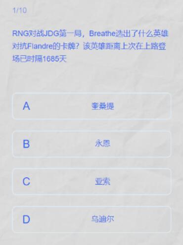 1、RNG和JDG的第一场比赛,Breathe选择了什么英雄来对抗Flandre的卡牌?距离这位英雄最后一次出现在上路已经过去了1685天。