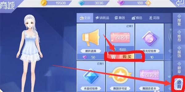 2.选择右侧【道具】,在产品中找到并购买【改名卡】。