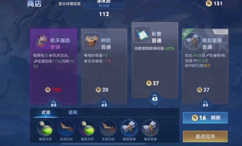 2、战斗商店优先购买【死亡灵药】、【玄威杖】、【爆锤】;