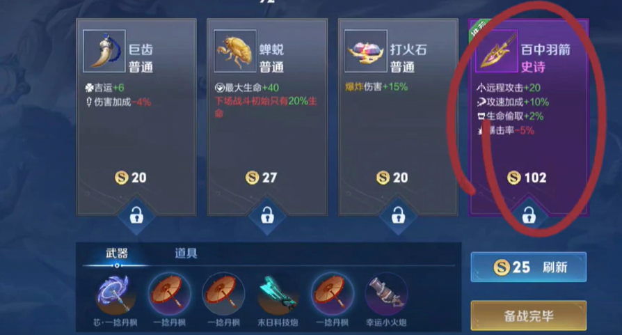 2、优先购买战斗商店中的【一扭红枫】、【幸运小炮】以及有吸血条目的武器;