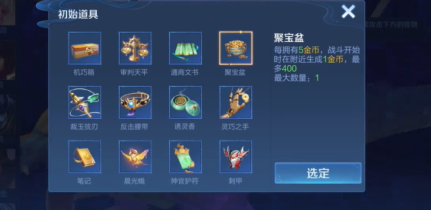 1.首先推荐英雄为【鲁班】,初始道具为【聚宝盆】,初始武器为【易捻丹凤】;