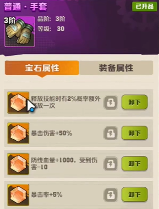 6.手套:防线免疫前7点伤害,防线生命+1400伤害-14,暴击伤害+70%,所有技能伤害+14%