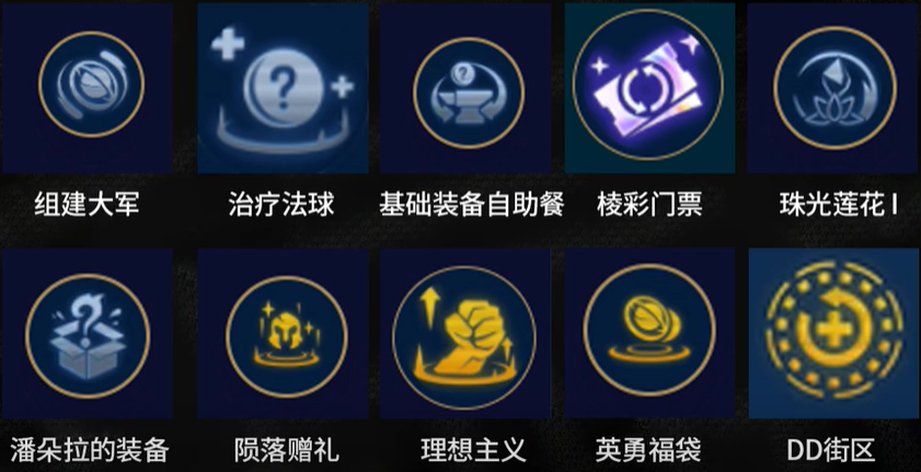 三、强化符文:组建军队、治疗球、基础装备、自助餐、棱镜券、珠光莲"、潘多拉装备、堕落礼物、理想主义、英雄福袋、DD方块