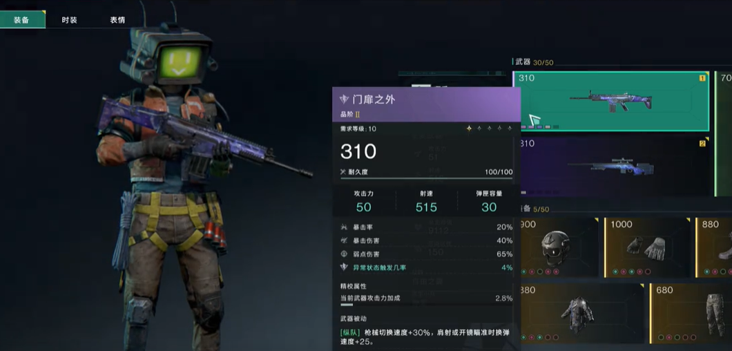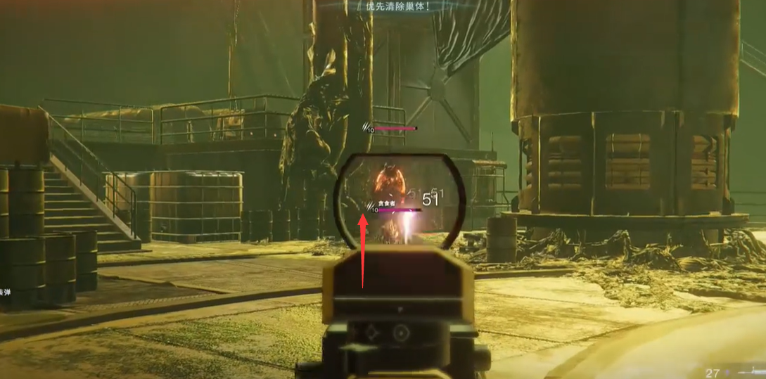 1、首先选择武器【门外】,然后站在远处攻击BOSS手中的加特林;