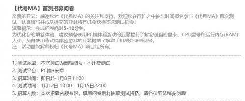 根据官方公布,本次测试正式开放时间为【1月12日11: 00】,对这款游戏感兴趣的朋友可以填写以上问卷获得资格。