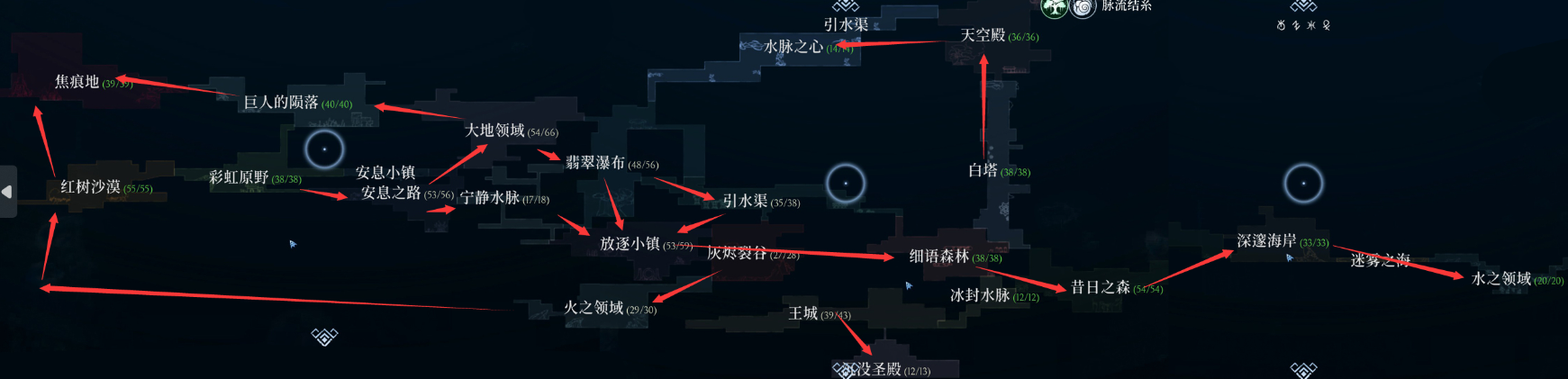 2、60级之前探索顺序:渡槽33级-宁静水脉35级-流放城镇39级-灯塔岛42级-低语森林44级-往日森林50级-深海海岸55级-水域57级等级——泪湖基地58级——王城60级——冰冻水脉60级