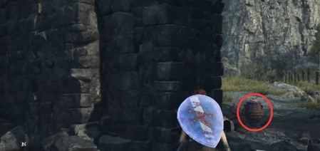 1、首先到村口外面,找到下图红圈处的火药桶。