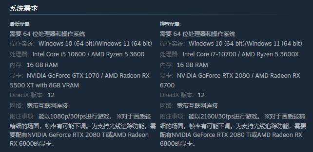 附加说明: 可以1080p/30fps 播放。 对于画质更精细的场景,帧速率可能会降低。要支持光线追踪,需要配备NVIDIA GeForce RTX 2080 Ti 或AMD Radeon RX 6800 的显卡。