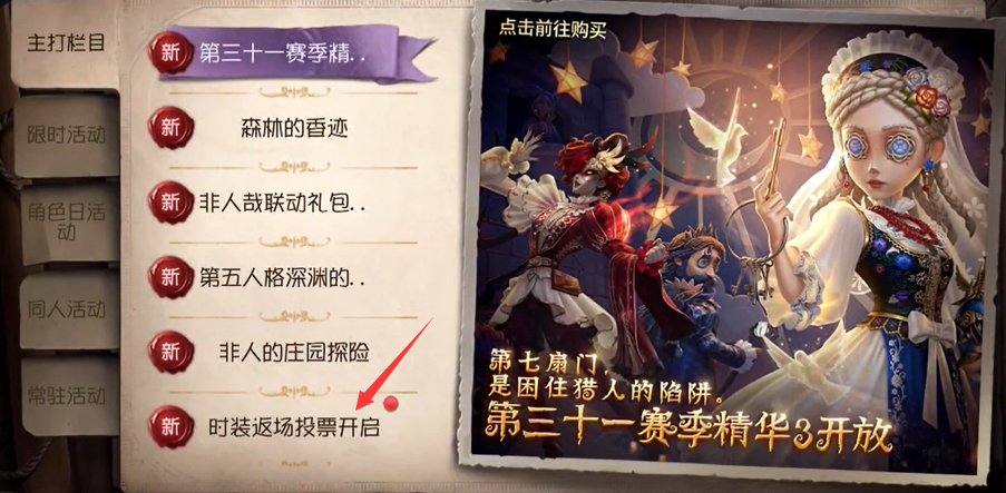 1.首先进入游戏,在主界面找到【限时活动】-【时装回归投票】;