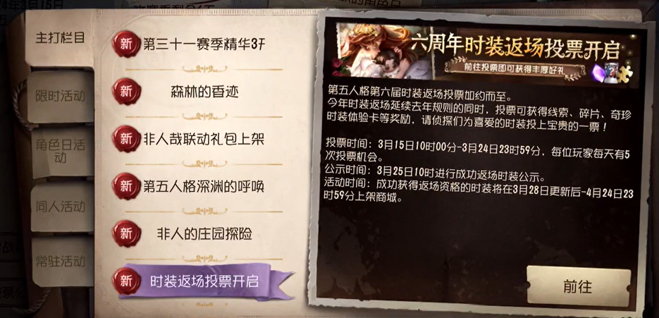 近日,《第五人格》游戏即将开启六周年活动。很多玩家想知道第五人格六周年返场皮肤投票入口在哪里。在主界面找到【限时活动】-【时装回归投票】。接下来小编就给大家详细介绍一下。感兴趣的玩家千万不要错过!
