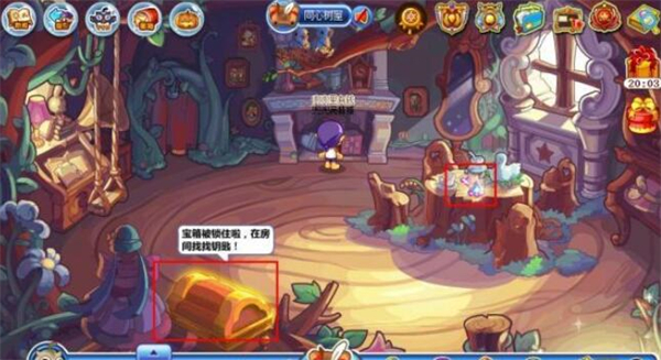 2.拿到桌子上的钥匙,点击左下角的宝箱。