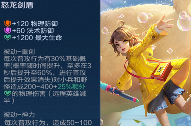 功效:可以提高云影的发育速度。怒龙剑盾更新后,可搭配的装备有:巨人之握、鞋子、怒龙剑盾、暗影战斧、冰痕之握、血魔之怒;可频繁触发多次攻击;