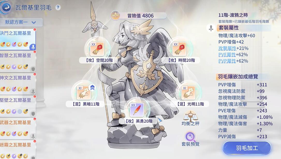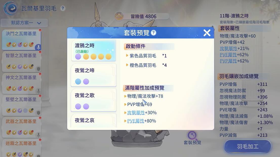 2.四片橙色羽毛+紫色羽毛可以触发套装,主要是攻击属性和伤害增加30%。