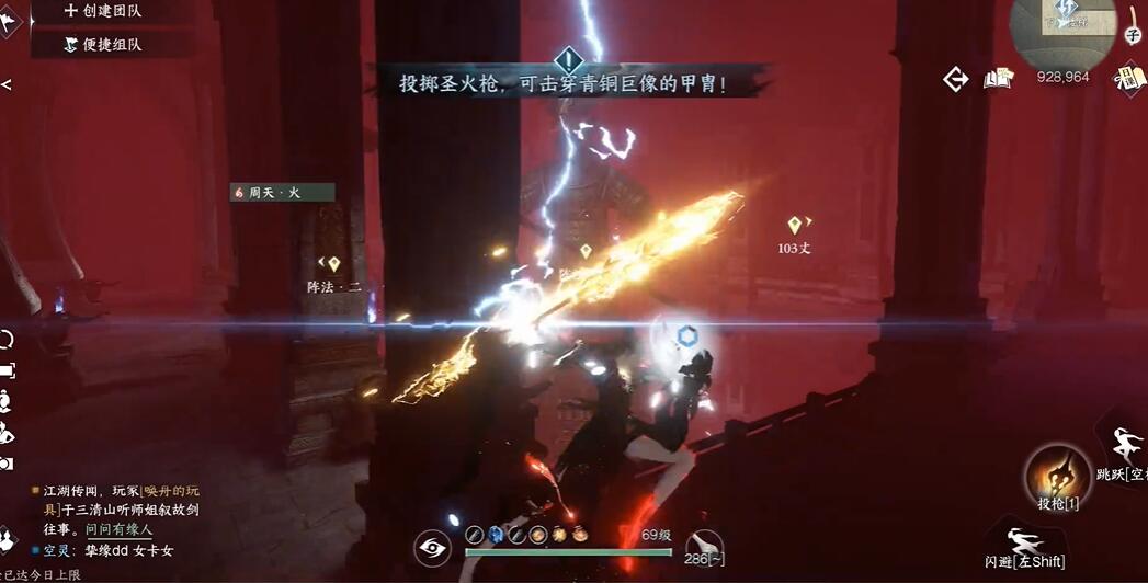 3、前往坐标(910, 1002),进入房间。看完线索,走到外面,将圣火枪扔穿青铜巨像的铠甲。
