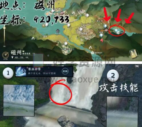 1.首先使用江湖的技能“冰掌”将瀑布冻结,然后使用普通攻击技能将其打破。