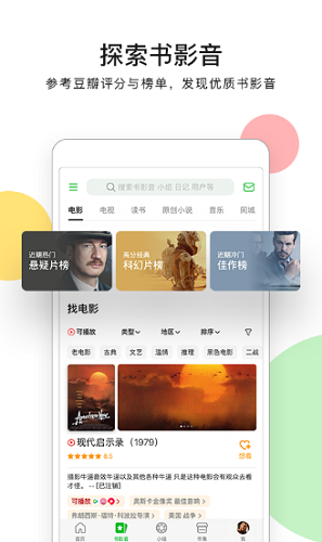 丰富庞大的图书、视频、视频库,让您快速找到自己喜欢的电影、电视剧、书籍、音乐。您可以浏览评分和评论,查看真实可信的受众和读者反馈,获取有效参考;还可以通过豆瓣榜、电影榜、书榜等进行探索和延伸,绘制出更系统的兴趣线。同时,您的标记和评论也将成为珍贵的文化足迹,储存在您的精神生活档案中。无论普世审美,还是小众喜好,在豆瓣上都能遇到相似的人,获得共鸣。