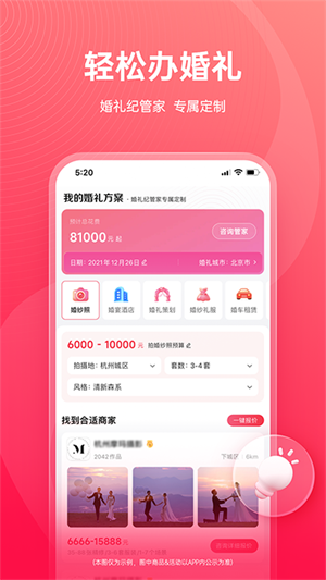 它识别您所在的城市,并提供非常精准的选择,保证每个人都可以通过软件更加自由、便捷地准备自己的婚礼,提供准确、全面的婚礼商务信息,让多种风格的选择更加便捷。