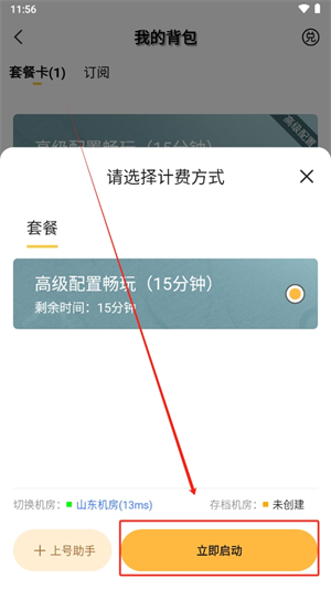 3、领取的免费时间可通过【我的】-【我的背包】查看套餐卡,点击【立即启动】生效(套餐卡领取后24小时内有效);