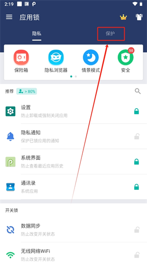 1。打开手机上安装的应用程序锁,单击以切换为主页上的[保护]接口;