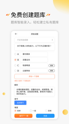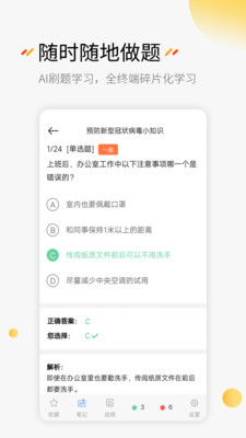 AI习题支持顺序习题、随机习题、模拟考场等增强记忆的习题,多终端习题支持(Android /iOS/applet /PC)和离线习题,让学生充分利用碎片化时间进行学习。