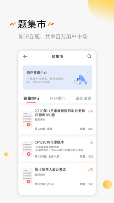 刷题神器提供了试题交易的“淘宝”平台,机构/作者可以将自己的题库变成付费题库,轻松实现知识变现,共同分享百万用户的市场。