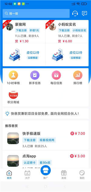 快悬赏app是一款非常流行的手机网赚软件。这里有各种各样的任务。可以选择自己喜欢的任务,比如试玩、视频刷、点赞、注册等。而且只需要点几下手机就能完成。你的任务越多,